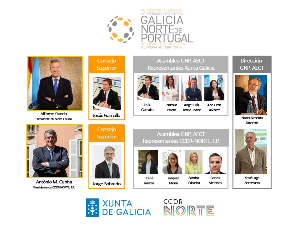 No padroado figura o propio presidente da Xunta, Jesús Gamallo (Director Xeral de Relacións Exteriores e coa UE) e Natalia Prieto (Directora Xeral de Administración Local). A AECT foi creada en 2008 mediante un convenio entre a Xunta e a portuguesa Comissão de Coordenação e Desenvolvimento Rexional do Norte (CCDR-N).